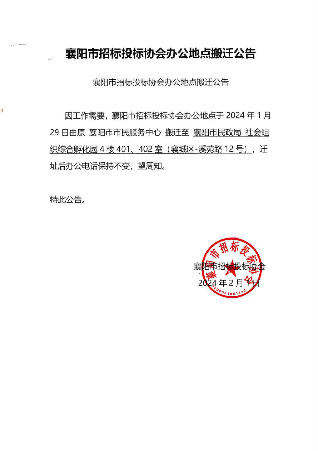 襄阳市招标投标协会办公地点搬迁公告